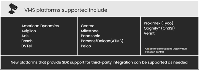 The vis|ability platform integrates various Video Management Systems (VMS), offering seamless video monitoring and control. vis|ability currently integrates with various VMS vendors at the SDK/API level. These integrations are product and version dependent and need to be made known to the vis|ability prior to onsite implementation. See the current list of supported vendors Below.